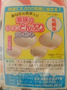 【概要】 ・エースコックのキャンペーン企画。 ・対象商品のスーパーカップの蓋の裏面のシリアル番号が必要。 ・対象商品1個ごとに宝箱ゲームにチャレンジ! 「ホントに焼いた本焼そば」1ケース(2000名)。 ・さらに対象商品6個でバスケットボールゲームにチャレンジ! 500名にiPodが当たる。 【条件】 ・スーパーカップ商品の購入 |